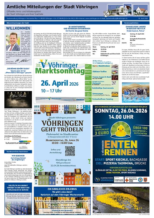 Hier können Sie sich die aktuellste und zurückliegende Ausgaben des Amts- und Mitteilungsblatt der Stadtverwaltung Vöhringen im PDF-Format herunterladen. Zum Lesen benötigen Sie nur einen der kostenlos erhältlichen PDF-Reader, z.B. den Adobe Reader.