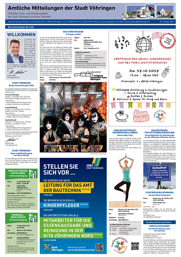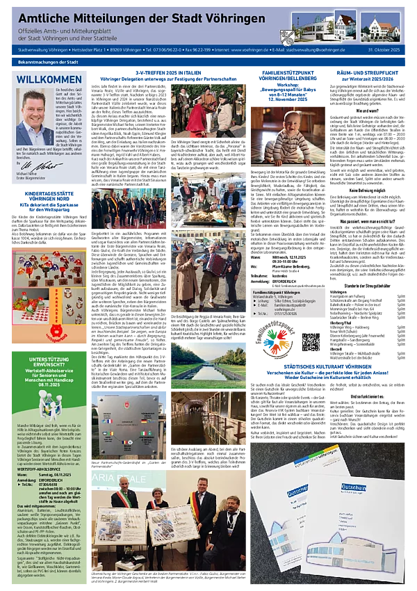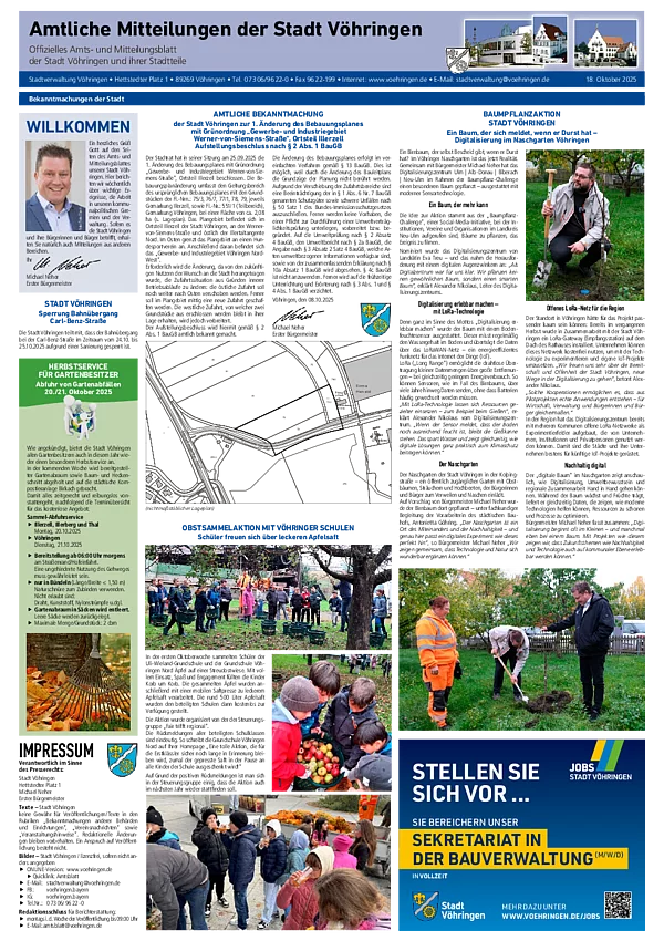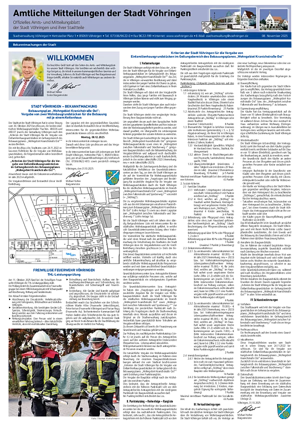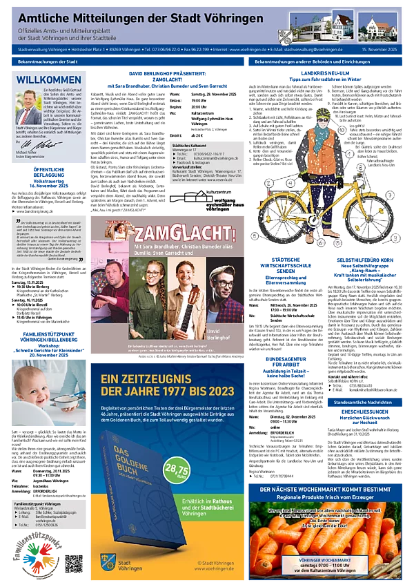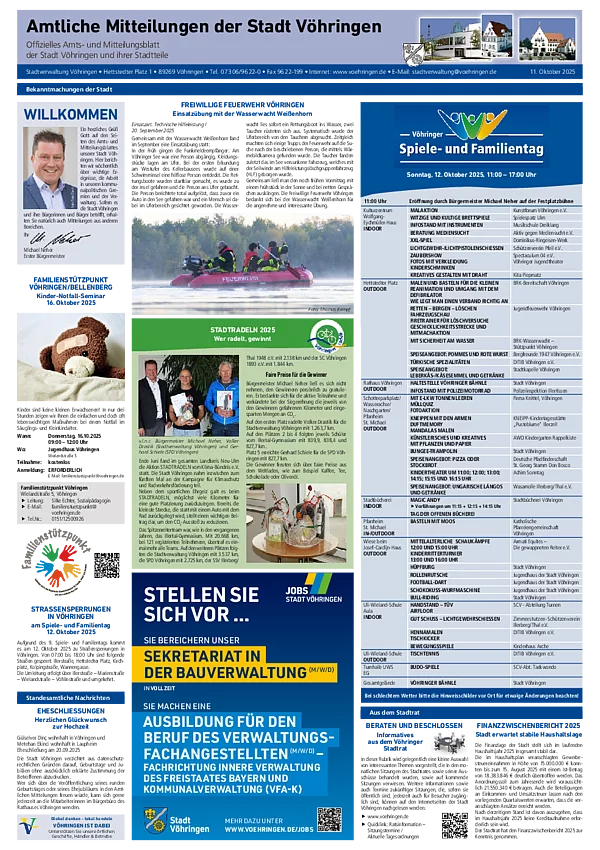 Hier können Sie sich die aktuellste und zurückliegende Ausgaben des Amts- und Mitteilungsblatt der Stadtverwaltung Vöhringen im PDF-Format herunterladen. Zum Lesen benötigen Sie nur einen der kostenlos erhältlichen PDF-Reader, z.B. den Adobe Reader.
