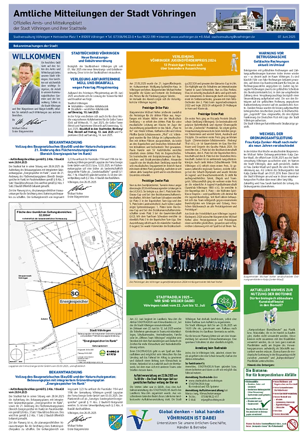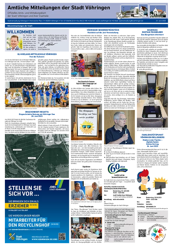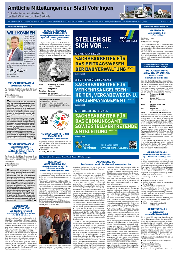 Hier können Sie sich die aktuellste und zurückliegende Ausgaben des Amts- und Mitteilungsblatt der Stadtverwaltung Vöhringen im PDF-Format herunterladen. Zum Lesen benötigen Sie nur einen der kostenlos erhältlichen PDF-Reader, z.B. den Adobe Reader.