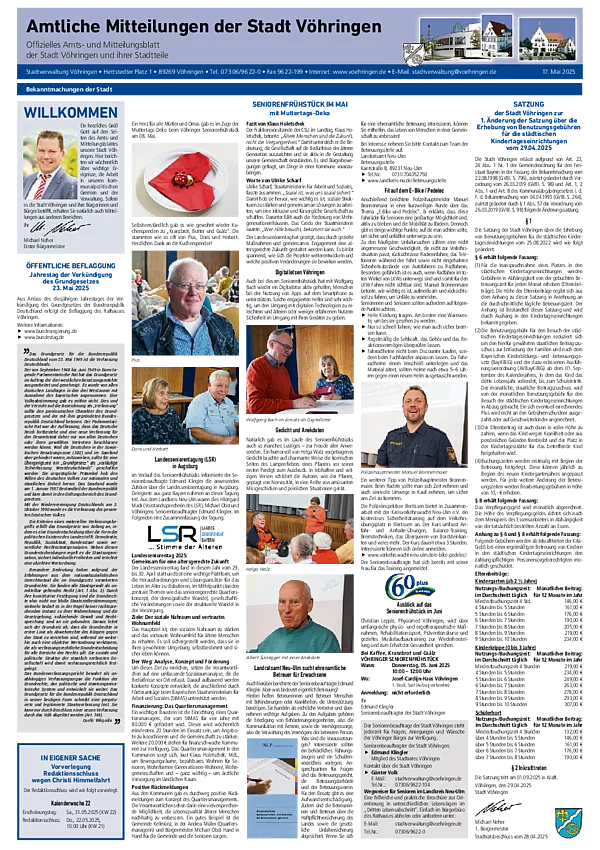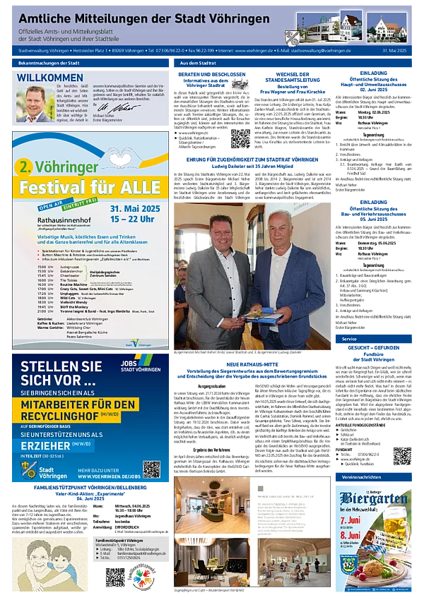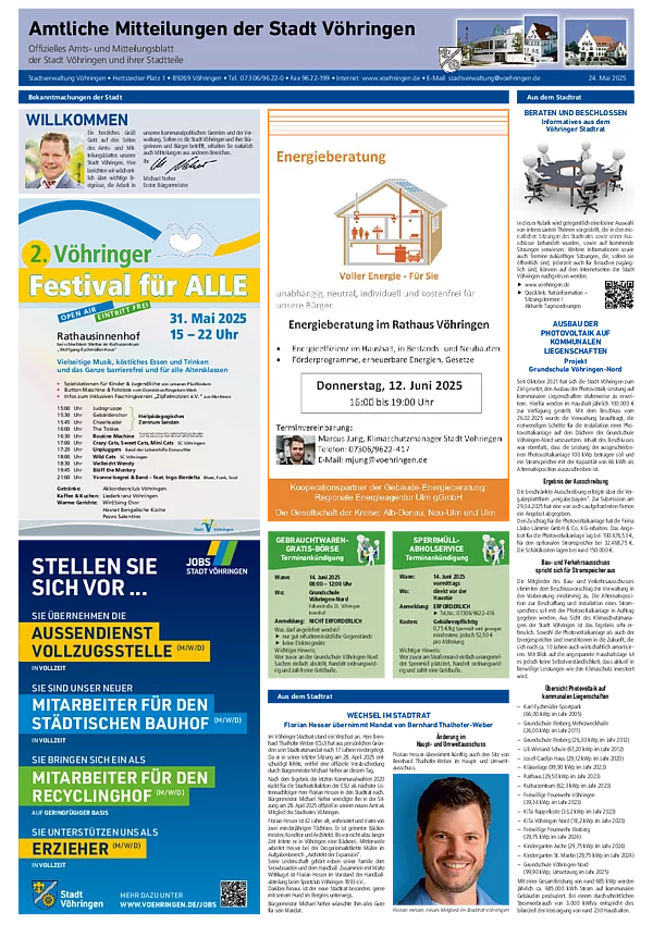 Hier können Sie sich die aktuellste und zurückliegende Ausgaben des Amts- und Mitteilungsblatt der Stadtverwaltung Vöhringen im PDF-Format herunterladen. Zum Lesen benötigen Sie nur einen der kostenlos erhältlichen PDF-Reader, z.B. den Adobe Reader.