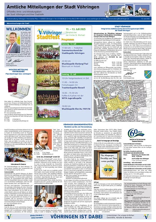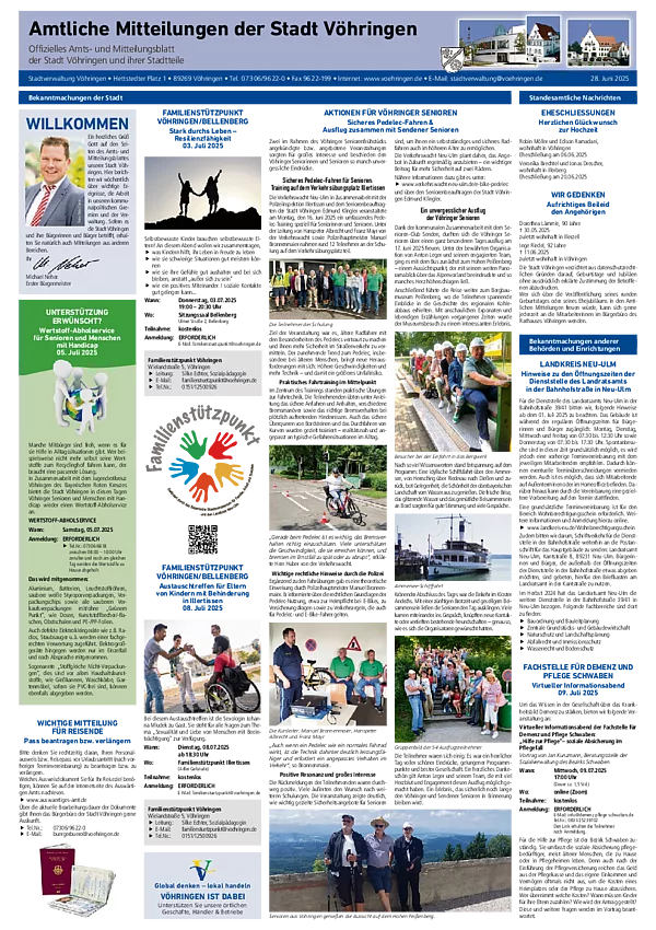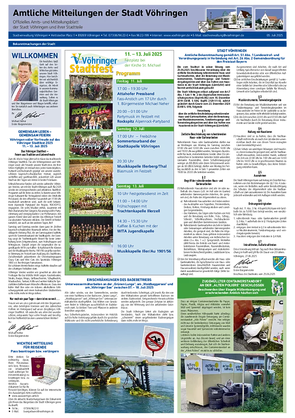 Hier können Sie sich die aktuellste und zurückliegende Ausgaben des Amts- und Mitteilungsblatt der Stadtverwaltung Vöhringen im PDF-Format herunterladen. Zum Lesen benötigen Sie nur einen der kostenlos erhältlichen PDF-Reader, z.B. den Adobe Reader.