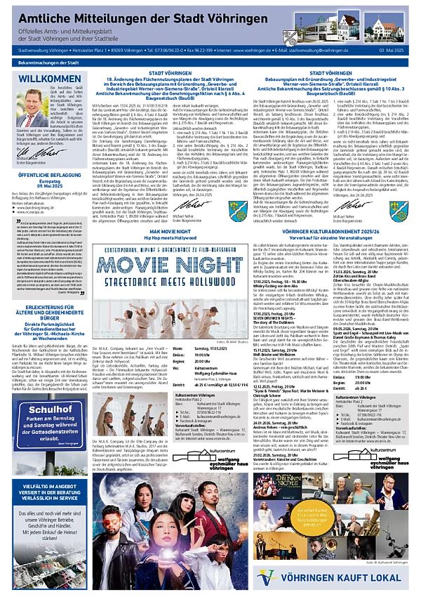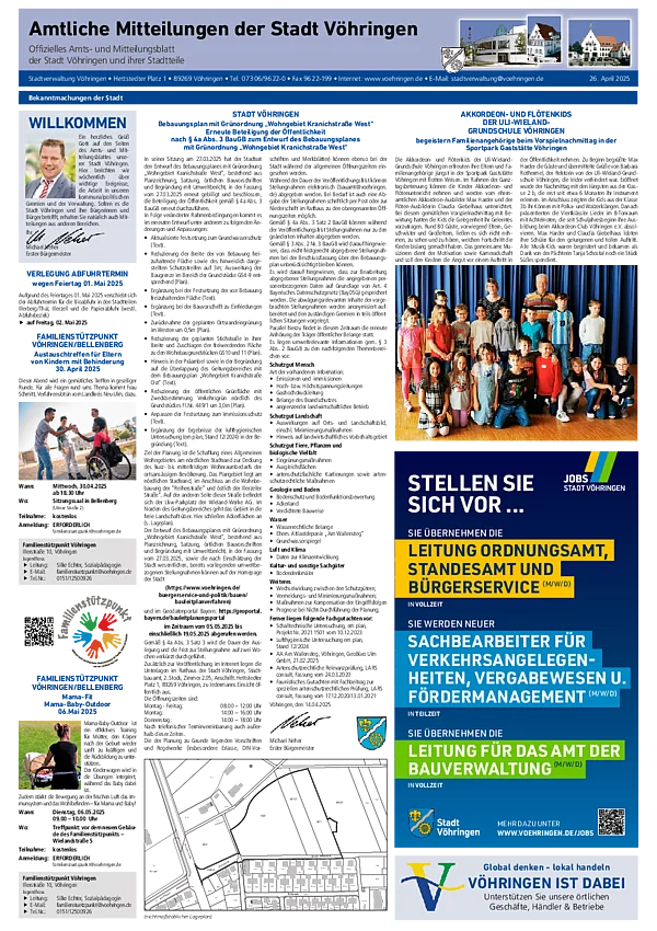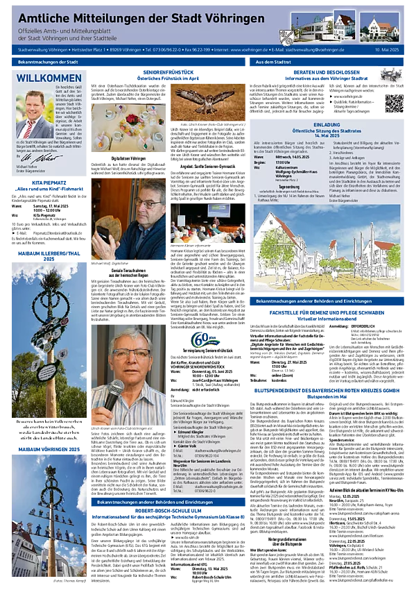 Hier können Sie sich die aktuellste und zurückliegende Ausgaben des Amts- und Mitteilungsblatt der Stadtverwaltung Vöhringen im PDF-Format herunterladen. Zum Lesen benötigen Sie nur einen der kostenlos erhältlichen PDF-Reader, z.B. den Adobe Reader.