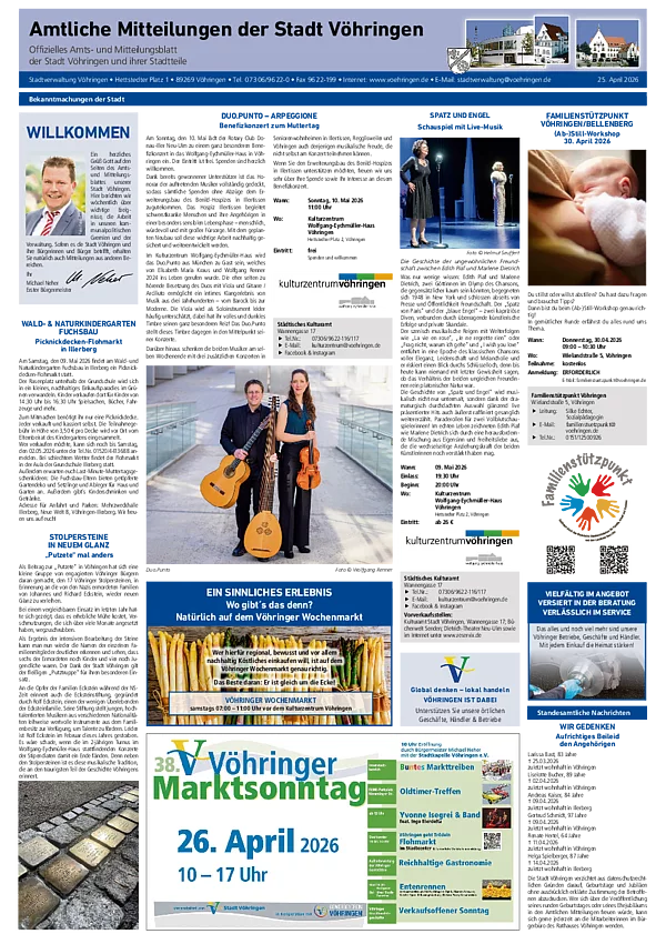 Hier können Sie sich die aktuellste und zurückliegende Ausgaben des Amts- und Mitteilungsblatt der Stadtverwaltung Vöhringen im PDF-Format herunterladen. Zum Lesen benötigen Sie nur einen der kostenlos erhältlichen PDF-Reader, z.B. den Adobe Reader.