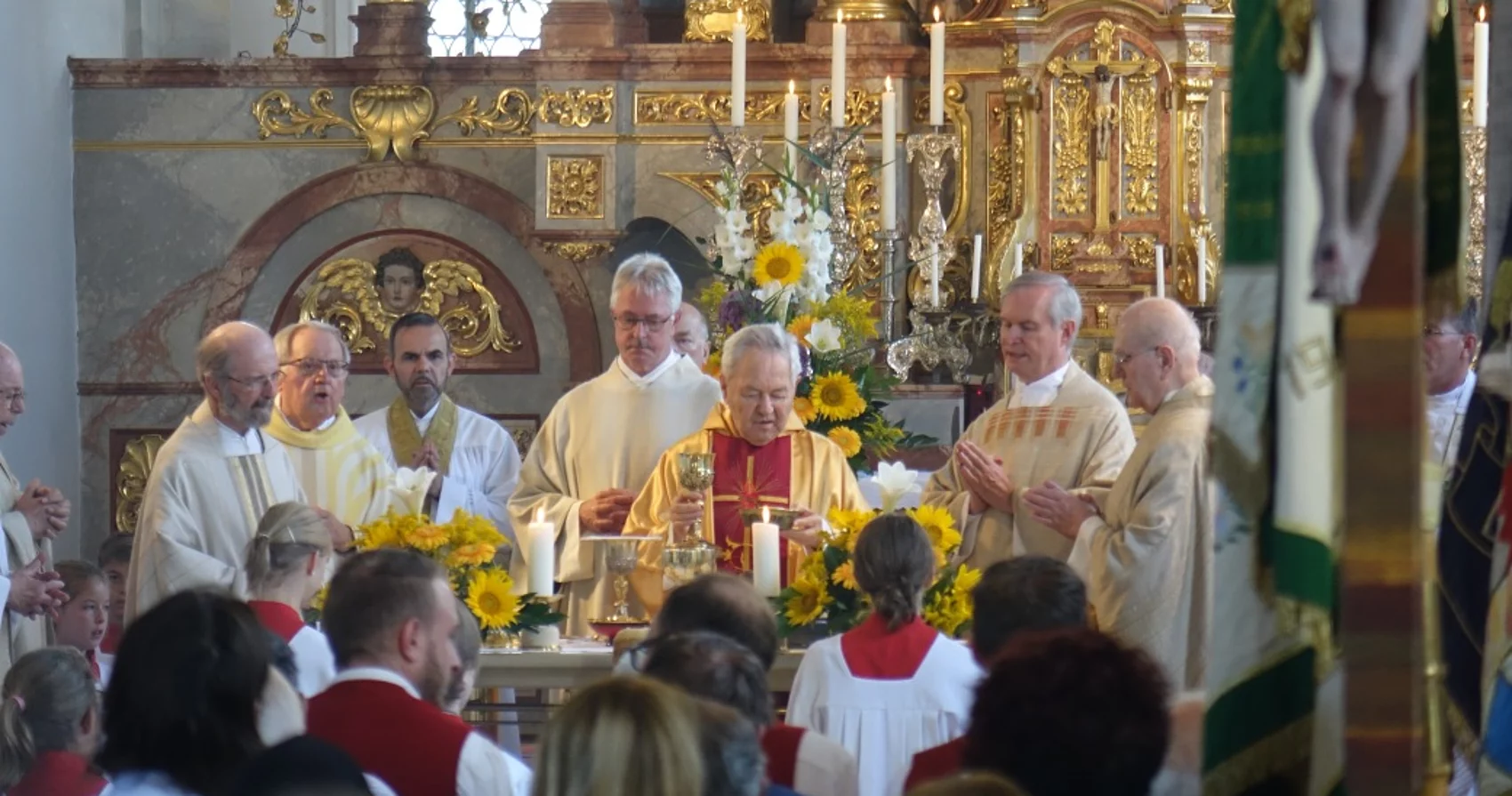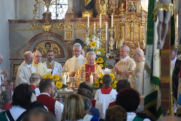 Mit einem Festzug von seinem Wohnhaus aus ging es begleitet von den Fahnenabordnungen und der Musikkapelle zur Heilig-Geist-Kirche in Durach, in der er den großen und feierlichen Festgottesdienst gemeinsam mit einer Vielzahl an Mitbrüdern feierte.
