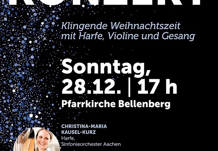 Klingende Weihnachtszeit mit Harfe, Violine und Gesang. Der Erlös kommt der anstehenden Renovierung der Pfarrkirche 'Unsere Liebe Frau vom Rosenkranz' in Bellenberg zugute.