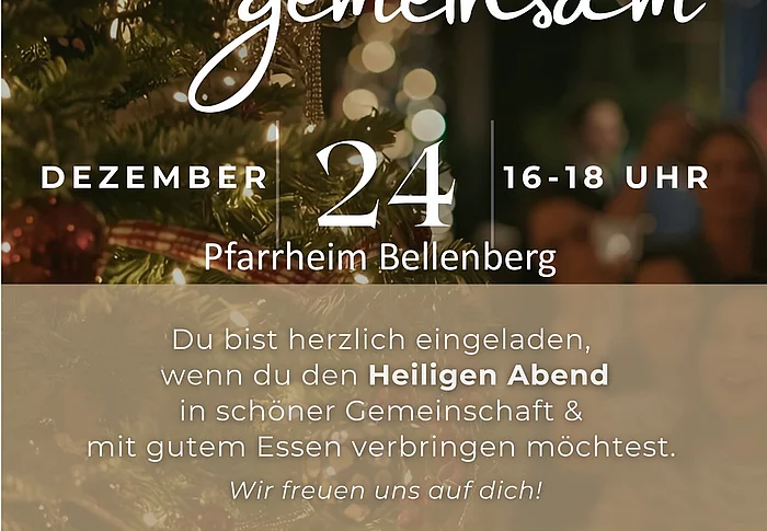Wir freuen uns, mit dir den Heiligen Abend zu verbringen! Du bist herzlich eingeladen, dich uns anzuschließen, egal ob jung oder alt, aus nah oder fern, ob arm oder reich. Wir wollen im Bellenberger Pfarrheim zusammenkommen, gemeinsam essen & trinken, Weihnachtslieder singen und uns von der Hoffnung, die Weihnachten bereithält, neu erfüllen lassen. WEIHNACHTEN gemeinsam lässt sich gut mit der Christmette um 18:00 Uhr in der Pfarrkirche Bellenberg vereinbaren. Melde dich gerne im Pfarrbüro unter der Tel.Nr. 07306/359900 an.