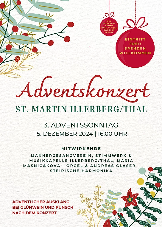 Am Sonntag, den 15. Dezember 2024, findet wieder das traditionelle Adventskonzert in der Illerberger Pfarrkirche St. Martin statt. Beginn ist um 16:00 Uhr. Mit dabei sind der Männergesangverein, Stimmwerk und die Musikkapelle Illerberg/Thal, der MGV-8-Zylinder, Maria Masnicakova an der Kirchenorgel sowie Andreas Glaser mit der Steirischen Harmonika.