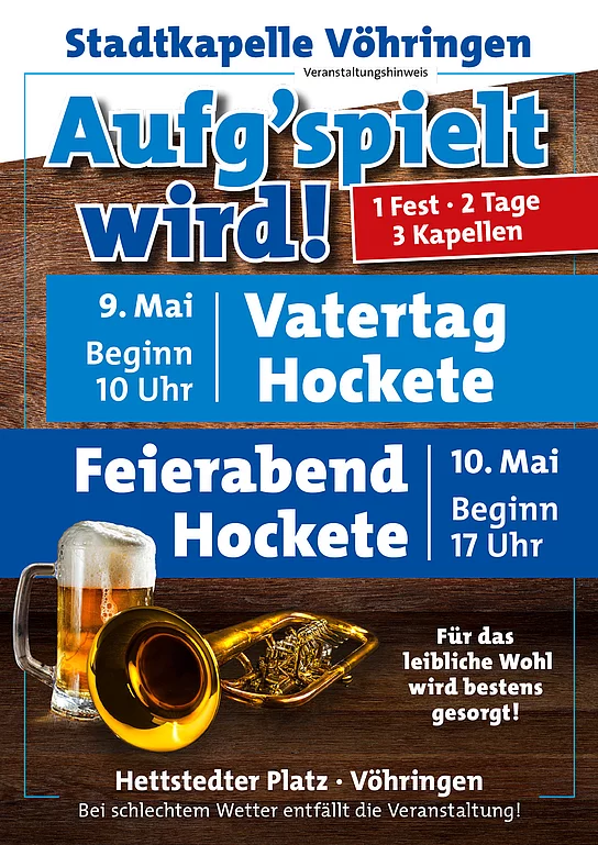 1 Fest, 2 Tage, 3 Kapellen Vöhringen – Zur Vatertag- und Feierabend-Hockete lädt die Stadtkapelle Vöhringen e.V. auf den Hettstedter Platz ein.