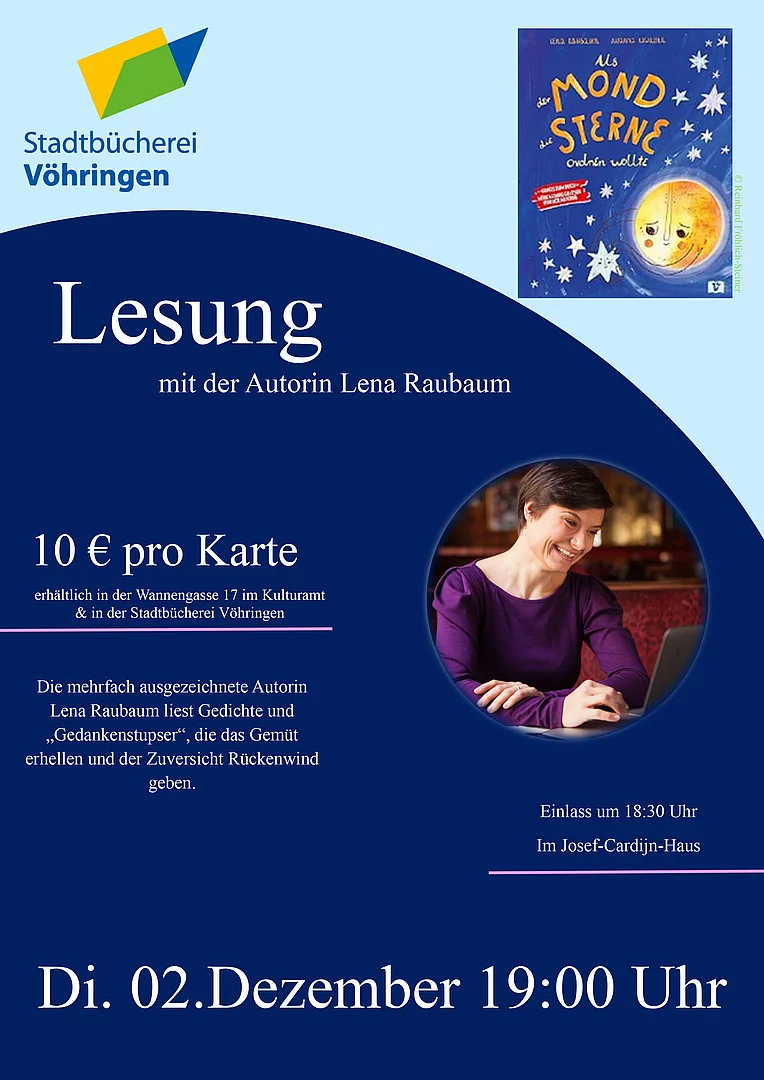 Die mehrfach ausgezeichnete Autorin Lena Raubaum liest Gedichte und "Gedankenstupser", die das Gemüt erhellen und der Zuversicht Rückenwind geben. (Tickets erhältlich im Kulturamt, Wannengasse 17, sowie in der Stadtbücherei Vöhringen. Einlass 18:30 Uhr.)