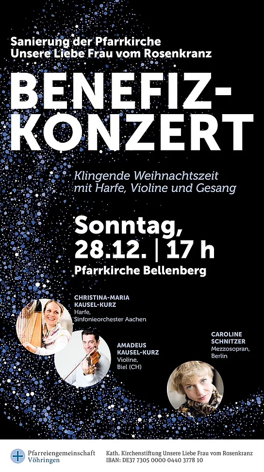 Klingende Weihnachtszeit mit Harfe, Violine und Gesang. Der Erlös kommt der anstehenden Renovierung der Pfarrkirche 'Unsere Liebe Frau vom Rosenkranz' in Bellenberg zugute.