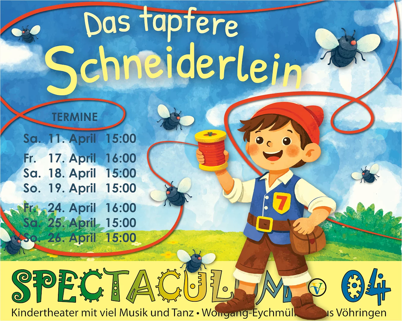 Das Märchen "Das tapfere Schneiderlein" ist landauf und landab bekannt. Wir von Spectaculum04 haben es so bearbeitet, dass es für die Zuschauer, ob jung oder alt ein Erlebnis ist. Die Musik von Fabian Weisenberger runden die Aufführungen ab. Wir freuen uns auf euren Besuch.