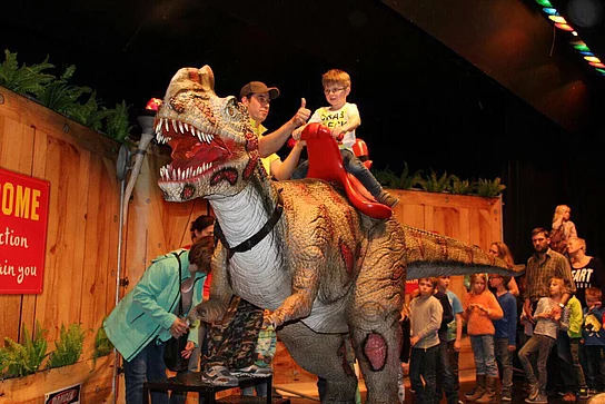 In einer atemberaubenden 80 min. Mitmachshow speziell für Kinder ( ab 3 Jahren) mit vollbeweglichen, computergesteuerten, lebensechten kleinen und großen Dinosauriern die speziell für diese Show angefertigt wurden, haben die Kinder die Gelegenheit Dinosaurier hautnah zu erleben, von der Geburt eines Dino Babys das live auf der Bühne aus einem gigantischen Ei schlüpft bis hin zum größten Räuber dieser Zeit dem T-Rex . Die Kinder haben sogar die Möglichkeit die Dinos anzufassen und zu streicheln - und ganz mutige Kinder dürfen sogar auf ihnen reiten. Die Dinos wirken unglaublich lebensecht und sind ein unvergessliches Abenteuer für die ganze Familie .