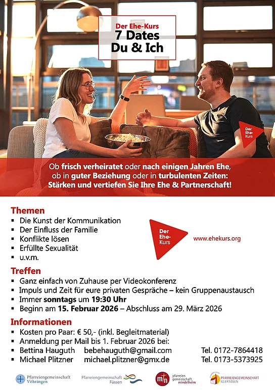 Der Ehe-Kurs ist eine Serie von sieben Online-Treffen und bietet Paaren die Möglichkeit, in ihre Beziehung zu investieren und eine starke Ehe aufzubauen. Wir laden zu einem Ehe-Kurs von Alpha ein - bequem von zuhause aus. 7 Treffen | sonntags | um 19:30 – 21:30 Uhr | Start: 15.02.2026 | Begleitung durch 3 Ehepaare | Online Plattform „Zoom“ | Computer, Notebook, Tablet oder Handy nötig | Link wird verschickt Sie können sich per E-Mail bis 01.02.2026 anmelden: Fam. Hauguth | bebehauguth@googlemail.com | Tel. 07306/9527020 Der Teilnehmerbeitrag pro Paar beträgt 50 €. Jeder Teilnehmer erhält ein eigenes Teilnehmerbuch mit Gesprächsimpulsen, Fragebögen und Platz für persönliche Notizen. Der Ehe-Kurs basiert auf christlichen Prinzipien, setzt jedoch keinen kirchlichen Hintergrund bei den Teilnehmern voraus.