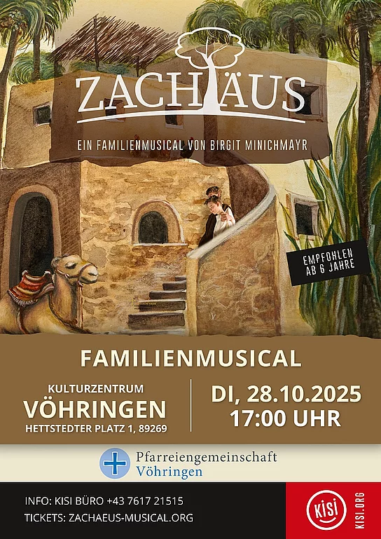Nach dem riesen Erfolg des Weihnachtsmusical 2024 kommen die Kisi Kids wieder nach Vöhringen und führen im Kulturzentrum ein neues Musical auf: ZACHÄUS. "Du bist geliebt, so wie du bist" – das sollte Zachäus eigentlich hören. Denn er fühlt sich zu klein, zu schwach und wird deswegen verspottet. Als er schließlich Zolleinnehmer für die Römer wird, kann er plötzlich Stärke zeigen – rücksichtslos bereichert er sich. Doch ein Augenblick verwandelt alles zum Guten – ein Augenblick in den Ästen eines großen, kräftigen Maulbeerfeigenbaumes. TICKET: https://register.kisi.org/KISI/zachaeus-voehringen/ DAS MUSICAL: https://register.kisi.org/KISI/zachaeus-voehringen/