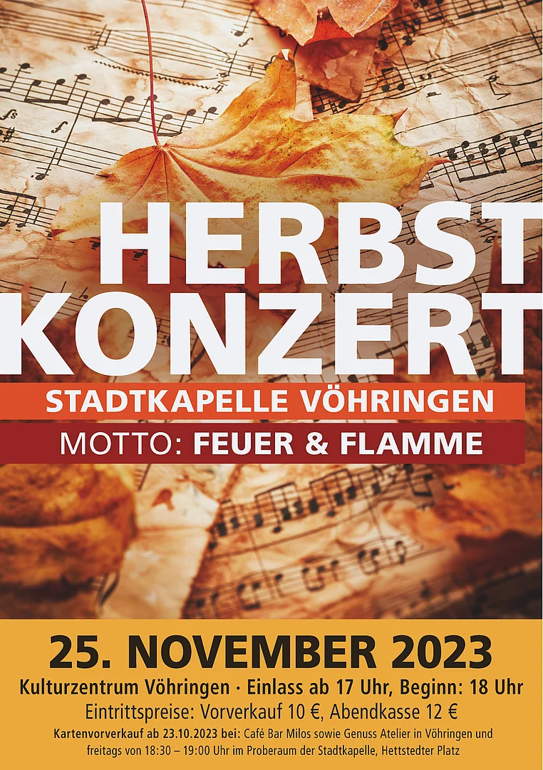 Auch in diesem Jahr veranstaltet die Stadtkapelle ihr alljährliches Herbstkonzert unter der Leitung von Andreas Blätzinger. Das Konzert steht diesmal unter dem Motto „Feuer und Flamme“. Das Programm reicht von Titeln wie „Walkürenritt“ und „Feuerzauber“ von Richard Wagner, über „Fire & Ice“ bis hin zur Filmmusik zu „Harry Potter und der Feuerkelch“. Es verspricht eine große musikalische Bandbreite, sodass für jeden etwas dabei sein sollte.