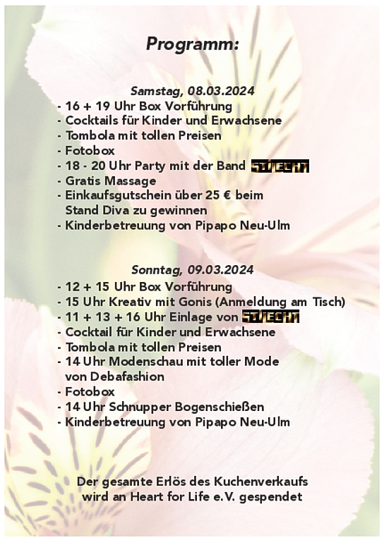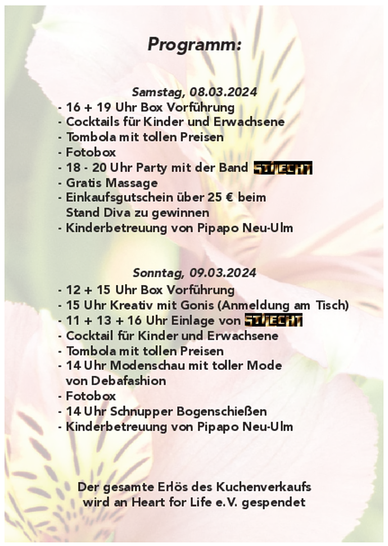 Die Messe mit Herz ist eine besondere Veranstaltung, bei der jeder die Möglichkeit hat, auszustellen, was er möchte – ob Kunst, Handwerk, Mode oder andere kreative Ideen. Dabei geht es nicht nur um das Ausstellen, sondern auch darum, Gutes zu tun: Ein Teil der Einnahmen wird immer an einen gemeinnützigen Verein gespendet, um die Gemeinschaft zu unterstützen.