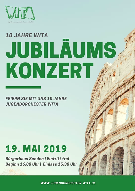 Anlässlich unseres 10-jährigen Bestehens veranstalten wir am: 19. Mai 2019 (Einlass: 15:30 Uhr / Beginn: 16:00 Uhr - Eintritt frei) im Bürgerhaus Senden, gemeinsam mit allen ehemaligen Musikern ein Konzert durch die letzten 10 Jahre WITA. Damit dürfen anspruchsvolle Konzertstücke genau so wenig fehlen wie Klassiker aus der traditionellen Blasmusik, Rock und Pop sowie Filmmusik. Es wartet also ein abwechslungsreiches und kurzweiliges Programm auf Sie. Wir freuen uns auf Ihren Besuch!