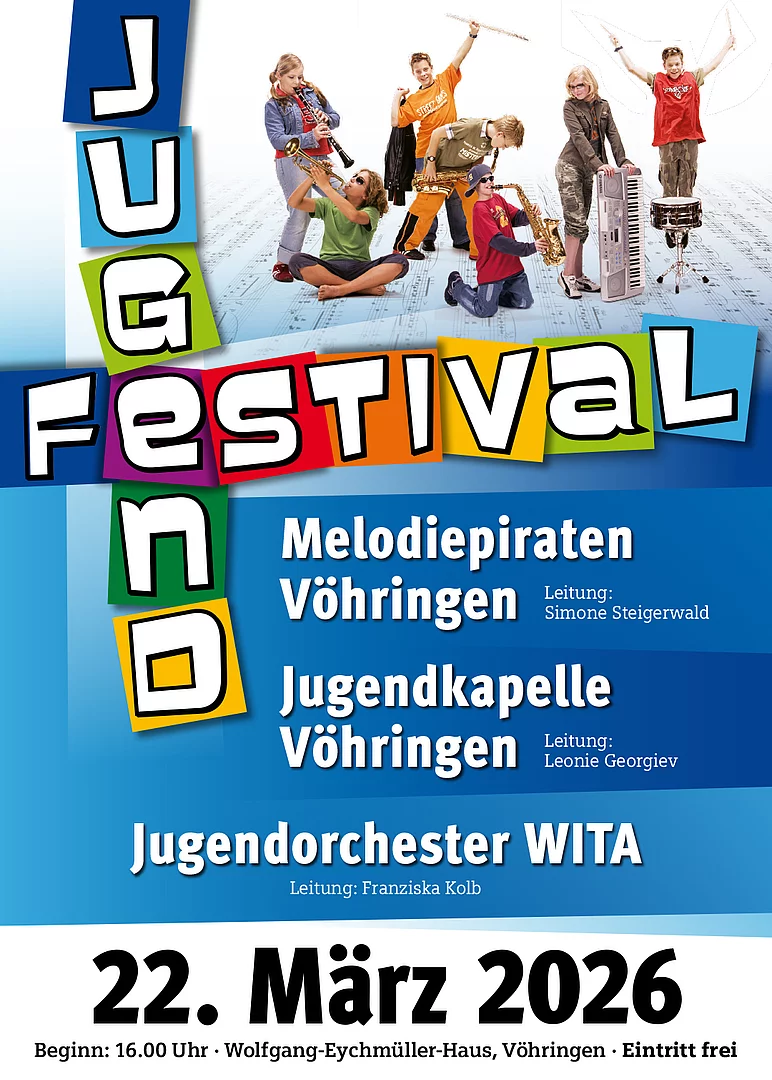 Die Bläserjugend der Stadtkapelle Vöhringen lädt Sie recht herzlich zum Jugendfestival am Sonntag, den 22. März 2026 im Wolfgang-Eychmüller-Haus in Vöhringen ein. Das Konzert beginnt um 16:00 Uhr, Einlass in den Saal ab 15:30 Uhr.
