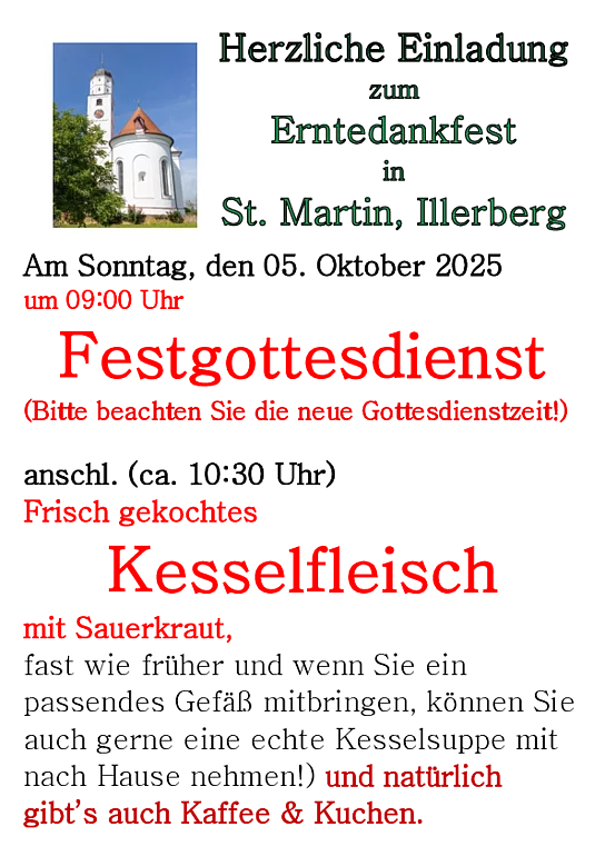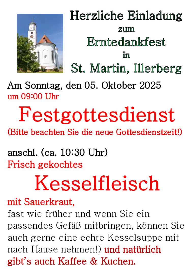 Zur Feier des Erntedankfestes am Sonntag, den 05. Oktober 2025, um 09:00 Uhr laden wir Sie ganz herzlich zum Erntedankgottesdienst in die St. Martinskirche in Illerberg ein. Alle Kinder sind eingeladen zur Kinderkirche im Pfarrheim. Anschließend (ca. 10:30 Uhr) können Sie bei uns frisch gekochtes Kesselfleisch mit Sauerkraut und frische Grieben genießen – fast wie früher.