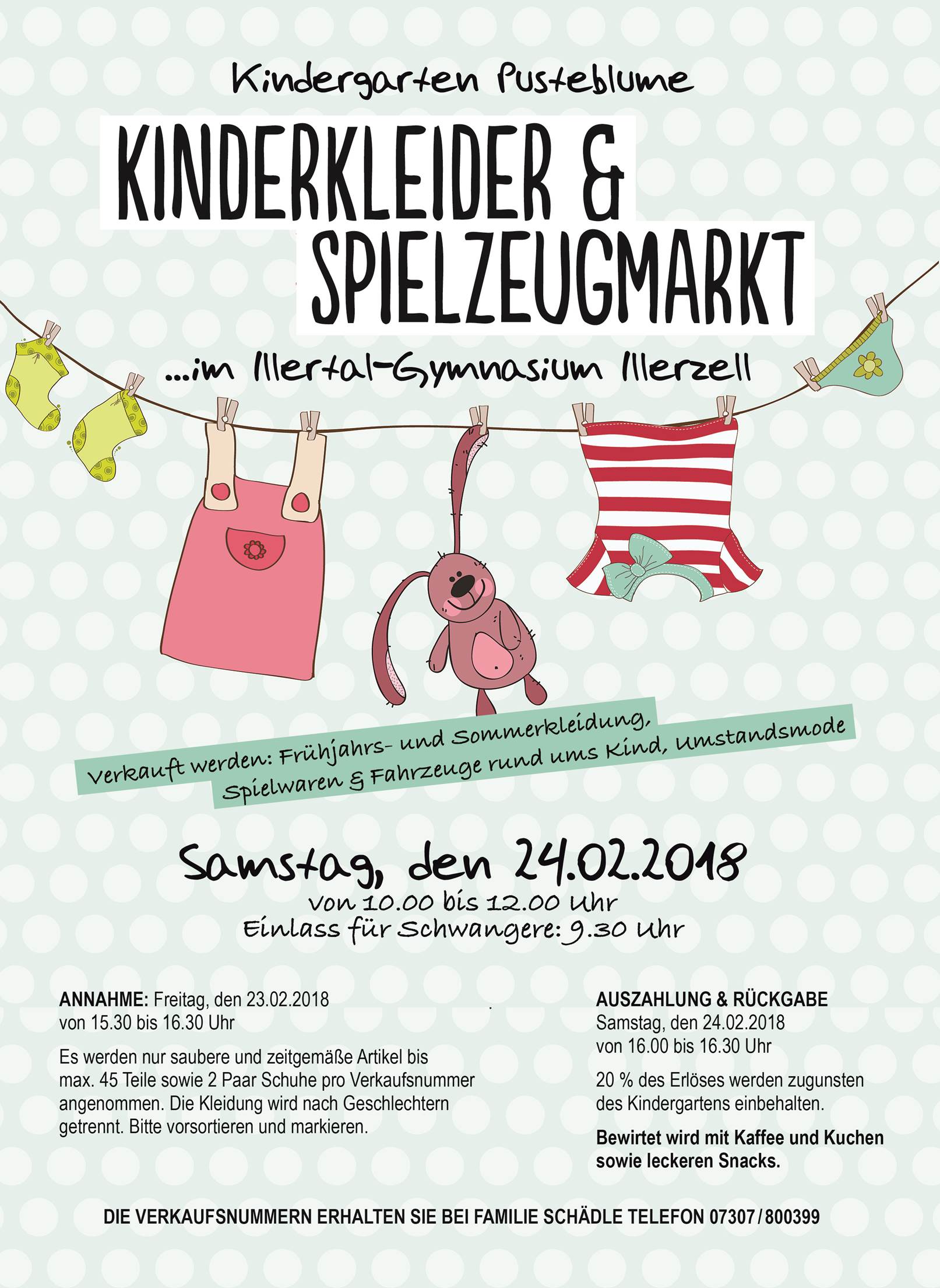 Der Kindergarten „Pusteblume“ Illerzell veranstaltet am Samstag, 24.02.2018, von 10.00 – 12.00 Uhr, einen Kinder-Kleidermarkt im Illertal-Gymnasium. Einlass für Schwangere ist um 9.30 Uhr. Verkauft werden saubere und zeitgemäße Frühjahrs- und Sommerkleidung, sowie Fahrzeuge, Spielsachen und Umstandsmode. Bewirtet wird mit Kaffee und Kuchen sowie leckeren Snacks.