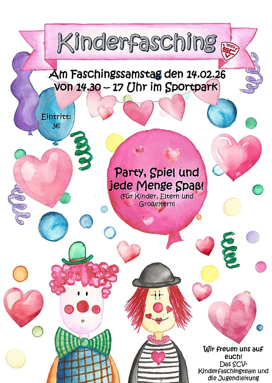 Kinderfasching im Sportpark Vöhringen Am 14.02.2026 von 14:30 bis 17:00 Uhr lädt der SCV herzlich zum fröhlichen Kinderfasching in den Sportpark Vöhringen ein! Freut euch auf eine bunte Faschingsparty mit lustigen Spielen, guter Laune und jede Menge Spaß für Kinder, Eltern und Großeltern. Verkleidungen sind ausdrücklich erwünscht – je bunter, desto besser! Eintritt: 3 € Kommt vorbei und verbringt einen unvergesslichen Nachmittag voller Lachen, Bewegung und Faschingsfreude!