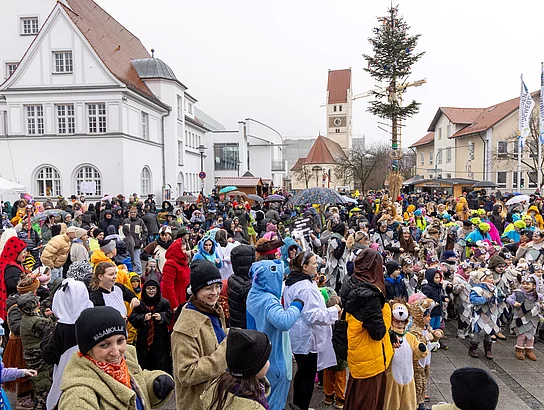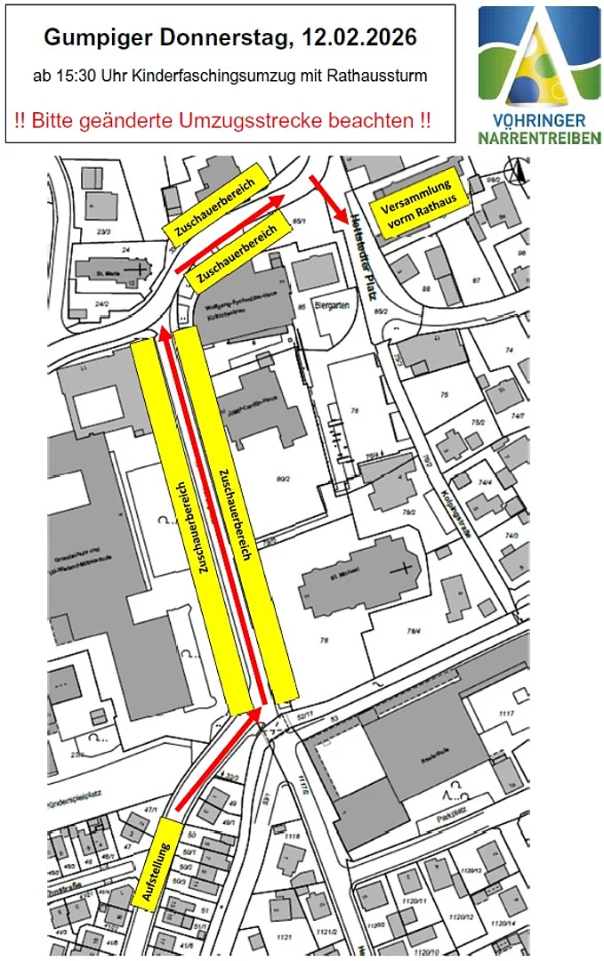 Beginn des Umzuges um 15.30 Uhr. Die Route verläuft von der Uli-Wieland-Schule zum Rathaus.