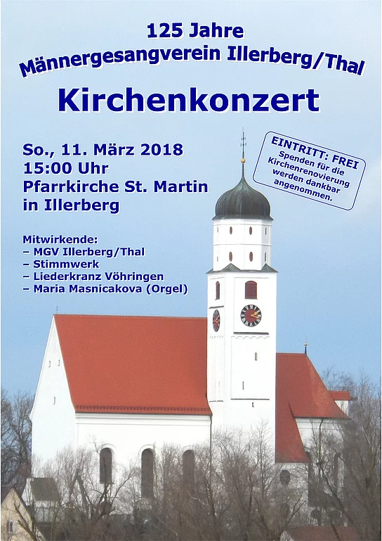 Kirchenkonzert am Sonntag, 11. März 2018 in Illerberg Der Männergesangverein Illerberg/Thal lädt am Sonntag, 11. März 2018 um 15:00 Uhr zu einem Kirchenkonzert in die St. Martinskirche in Illerberg ein. Neben dem MGV-Männerchor und dem gemischten Chor Stimmwerk wirkt als Gastchor der Vöhringer Liederkranz bei dem besinnlichen Konzert zur Fastenzeit mit. An der Orgel spielt die Kirchenmusikerin Frau Maria Masnicakova. Der Eintritt ist frei. Spenden kommen der Renovierung der St. Martinskirche zugute. Mit dem Kirchenkonzert beginnt der MGV Illerberg/Thal sein Jubiläumsjahr zur 125-jährigen Vereinsgründung, welches heuer gefeiert wird. Aus diesem Anlass findet im Herbst ein Jubiläumskonzert statt. Der Termin steht mit Samstag, 10. November 2018 bereits fest.