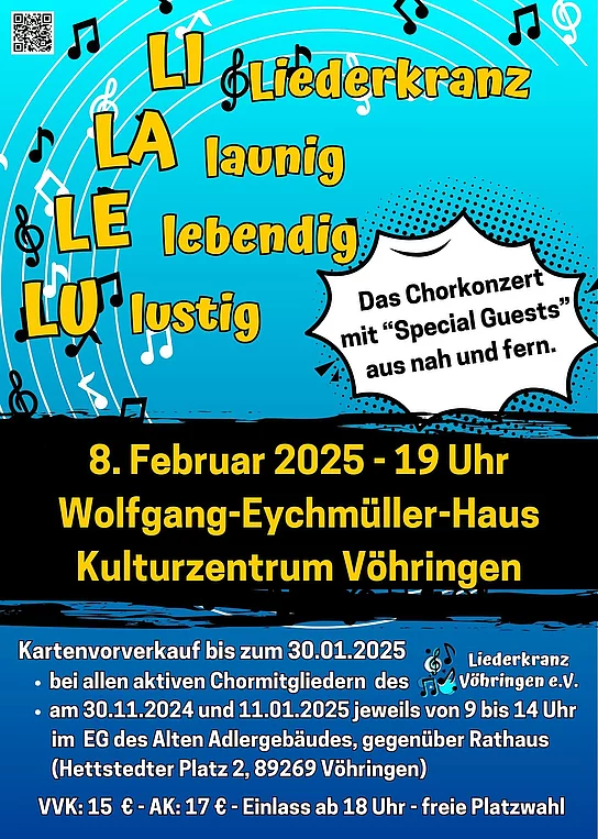 Der Liederkranz Vöhringen e.V. veranstaltet am 08.02.2025 um 19:00 Uhr im Kulturzentrum Wolfgang-Eychmüller-Haus Vöhringen ein Chorkonzert. Freuen Sie sich auf ein bunt gemischtes, fröhliches Programm mit Überraschungsgästen aus nah und fern.