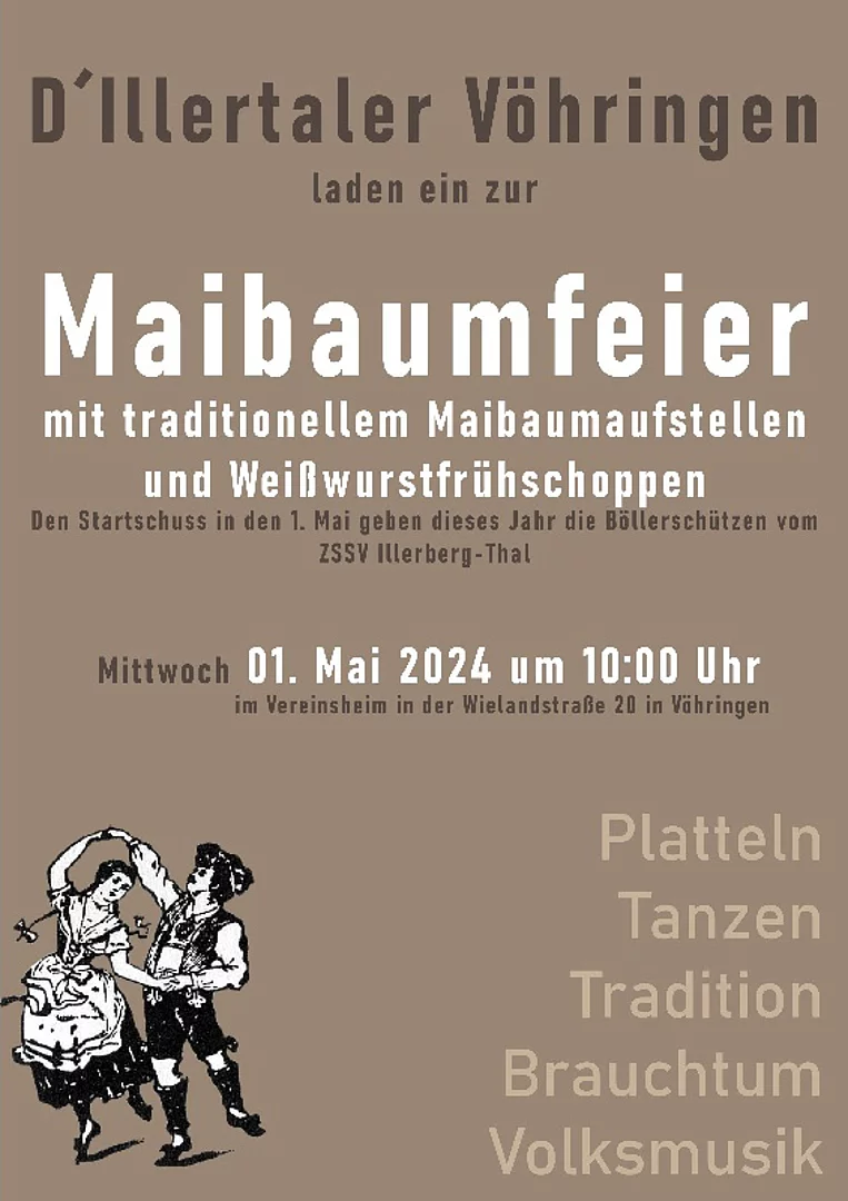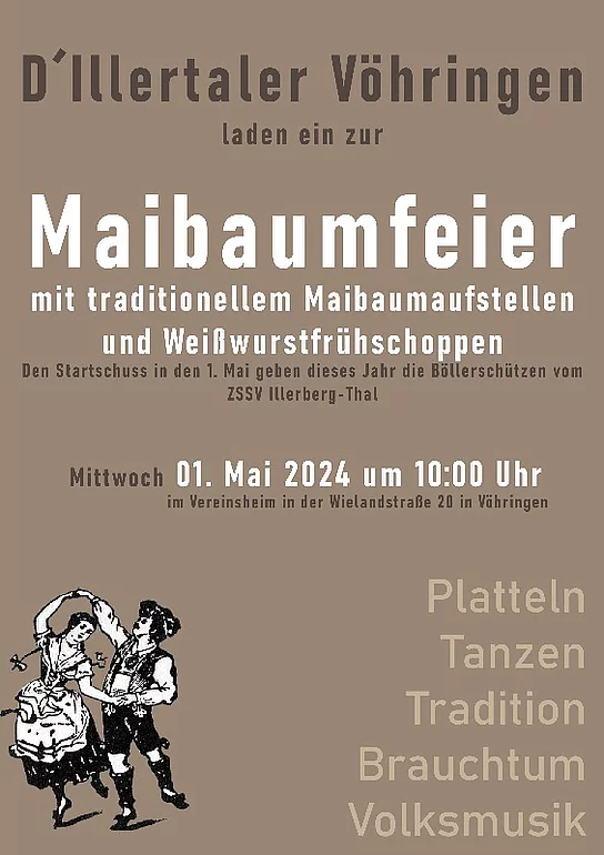 Der Heimat- und Volkstrachtenverein D’Illertaler Vöhringen e.V. stellt wie jedes Jahr nach alter Tradition vor seinem Vereinsheim in der Wielandstraße den Maibaum auf. Dieses Jahr werden sie akustisch unterstützt von den Böllerschützen.