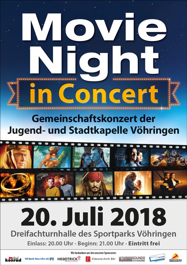 Nach dem Erfolg der ersten „Movie Night in Concert“ im Jahr 2016 will die Stadtkapelle Vöhringen allen Musik- und Filmbegeisterten auch in diesem Jahr ein ganz besonderes Highlight bieten. Wie es der Titel des Konzertes schon verrät, nehmen die über 65 Musiker der Jugend- und Stadtkapelle Vöhringen Sie gemeinsam mit auf eine musikalische Filmreise, die sowohl akustisch als auch visuell einiges zu bieten hat. Damit dieses Konzert auch bei schlechter Witterung stattfinden kann, wird der Kinosaal dieses Mal gleich in die Dreifachsporthalle des SC Vöhringen verlegt. Für die Kinoatmosphäre mit Gänsehaut-Garantie sorgt eine über 16 qm große Videoprojektion in bester HD-Qualität, auf der parallel zum jeweiligen Musikstück ein perfekt darauf abgestimmter Zusammenschnitt von Originalfilmszenen zu sehen sein wird. Natürlich darf an einem solchen Abend ein passendes Rahmenprogramm mit den Tanzgruppen des SC Vöhringen nicht fehlen. Freuen Sie sich also auf einen unvergesslichen Abend, der Ihnen sicherlich noch lange in Erinnerung bleiben wird – die Stadtkapelle Vöhringen freut sich auf Ihr Kommen. Einlass 20.00 Uhr - Beginn 21.00 Uhr