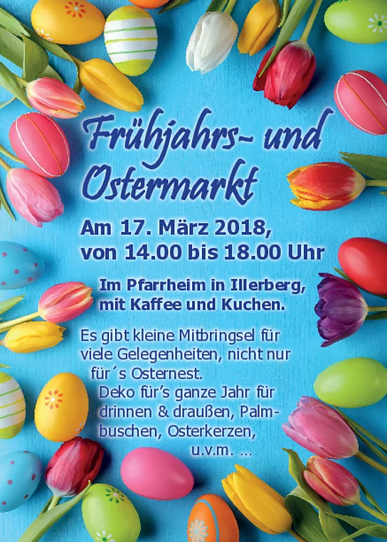 Am Samstag, 17.03.2018, 14.00 Uhr bis 18.00 Uhr, und Sonntag, 18.03.2018, von 17.00 Uhr - 19.00 Uhr, findet im Pfarrheim in Illerberg der Osterbasar statt. Wir laden Sie hierzu herzlich ein.