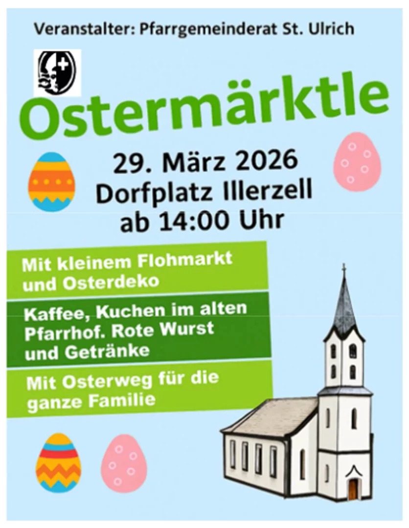 Beim Ostermärktle können sie auf dem kleinen Flohmarkt stöbern oder Osterdeko kaufen. Für das leibliche Wohl gibt es Kaffee und Kuchen, Rote Wurst und Getränke. Es gibt einen Osterweg mit interaktiven Aktionen für die ganze Familie.