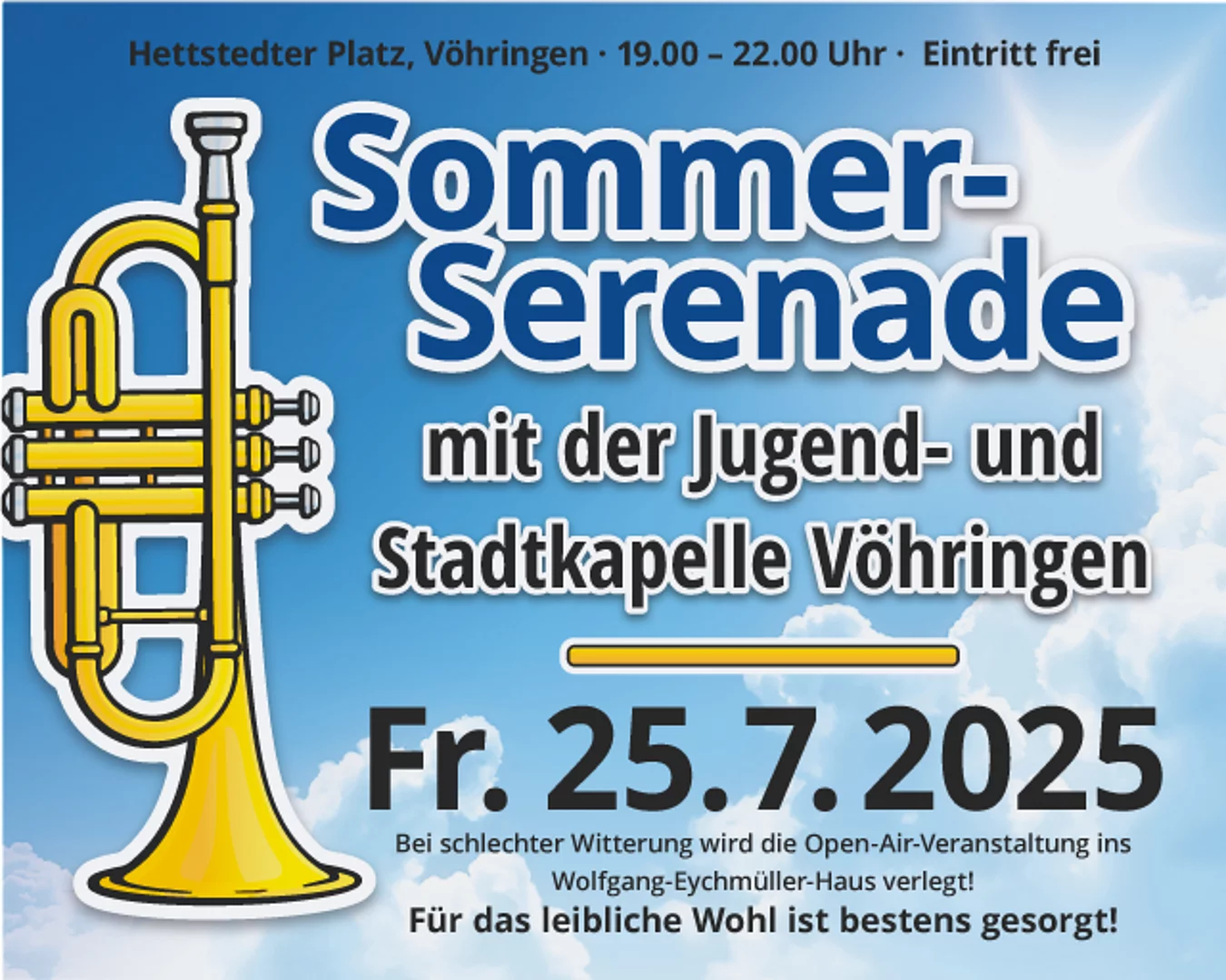 Bei gutem Wetter findet die Sommer-Serenade auf dem Hettstedt Platz (Festplatz an der Wasserachse) in Vöhringen statt, bei schlechter Witterung im Saal des Wolfgang-Eychmüller-Hauses.