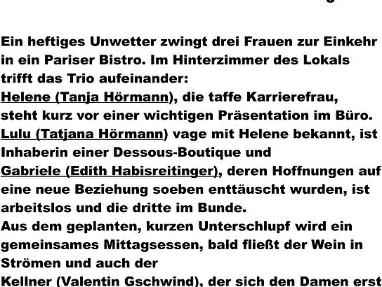 Das Theaterstück handelt davon, dass 3 Frauen wegen eines heftigen Unwetters zufällig im Hinterzimmer eines Lokals zusammentreffen. Aus dem geplanten Unterschlupf wird ein gemeinsames Mittagessen und eine ereignisreiche Nacht. Auch ein junger Kellner spielt eine nicht unwesentliche Rolle, dass sich alle besser kennenlernen.