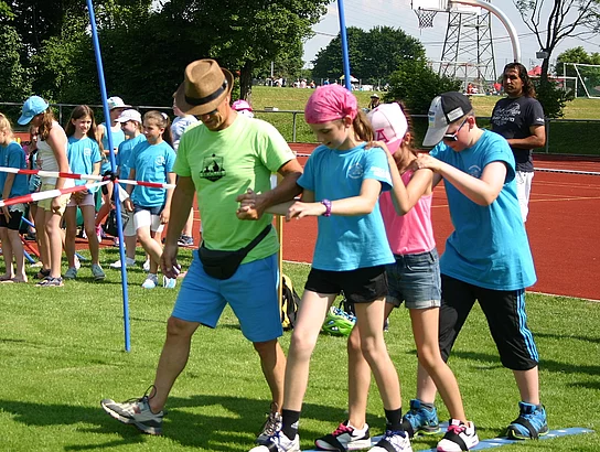 | Bewegung macht Spaß! Gemeinsame Aufwärmaktion aller Kinder auf dem Stadionfeld |