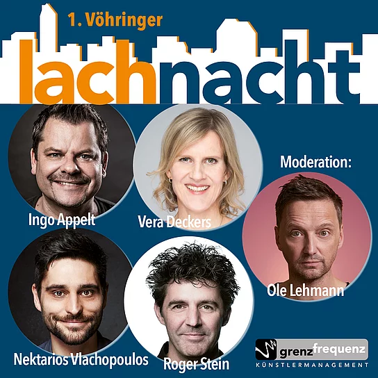 Schon der englische Schriftsteller Charles Dickens war der Meinung, dass nichts in der Welt so ansteckend wirkt wie Lachen und gute Laune. So wartet bei der ersten Vöhringer Lachnacht ein fantastischer Mix aus Kabarett und Comedy auf Sie! Die Moderation des Abends übernimmt der gut gelaunte Comedian Ole Lehmann, der Tacheles spricht über die wirklich wichtigen Themen im Leben. Dazu eingeladen wurden die Kabarettisten Ingo Appelt, Vera Deckers und Nektarios Vlachopoulos. Am Flügel flegelt Roger Stein zwischen Comedysongs, Liedermacherei und Post-Romantik in kraftvoller Vielseitigkeit, mit Selbstironie und Charme.