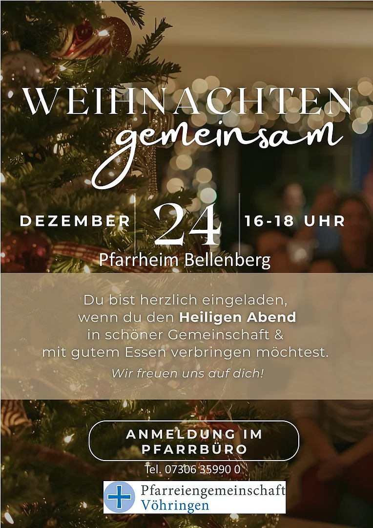 Wir freuen uns, mit dir den Heiligen Abend zu verbringen! Du bist herzlich eingeladen, dich uns anzuschließen, egal ob jung oder alt, aus nah oder fern, ob arm oder reich. Wir wollen im Bellenberger Pfarrheim zusammenkommen, gemeinsam essen & trinken, Weihnachtslieder singen und uns von der Hoffnung, die Weihnachten bereithält, neu erfüllen lassen.  WEIHNACHTEN gemeinsam lässt sich gut mit der Christmette um 18:00 Uhr in der Pfarrkirche Bellenberg vereinbaren. Melde dich gerne im Pfarrbüro unter der Tel.Nr. 07306/359900 an.