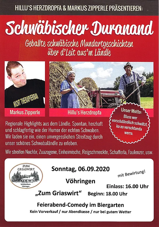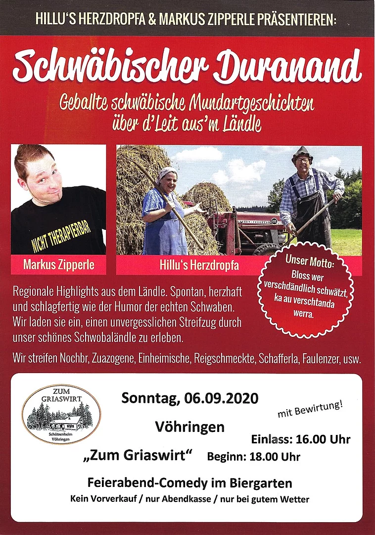 Schwäbischer Duranand mit Hillu´s Herzdropfa und Markus Zipperle Feierabend-Comedy im Biergarten Schwäbische Mundartgeschichten über d´Leit aus´m Ländle. Die Veranstaltung findet mit Bewirtung nur bei gutem Wetter statt. Kein Kartenvorverkauf, nur Abendkasse