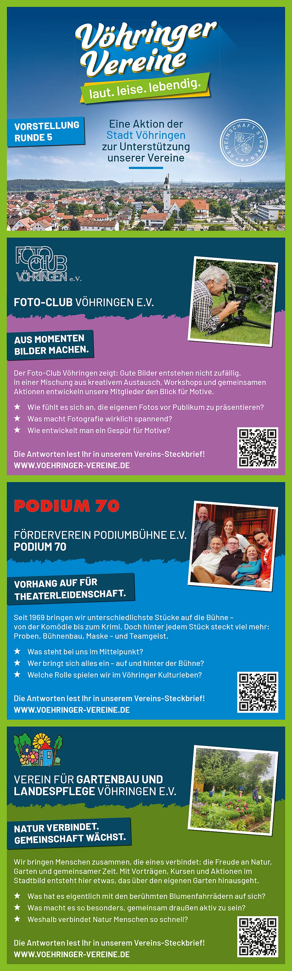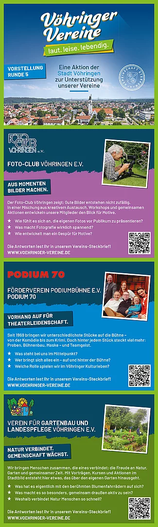 Ganz aktuell stellen sich der Foto-Club Vöhringen e.V., der Förderverein Podiumbühne Vöhringen e.V. - Podium 70 sowie der Verein für Gartenbau und Landespflege Vöhringen e.V. vor. Bereits in der Vergangenheit vorgestellte Vereine können zudem auf www.voehringer-vereine.de "erkundet" werden.