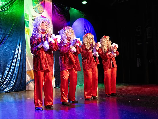 In leuchtendem Rot wirbelten danach die Illerberger Faschingsfrauen alias „Jacob Sisters“ über die Bühne – mit Stimmungshits wie „Auf dem Weg nach Aschaffenburg“ und dem legendären „Gartenzwerg-Marsch“. Mitsingen ausdrücklich erwünscht!