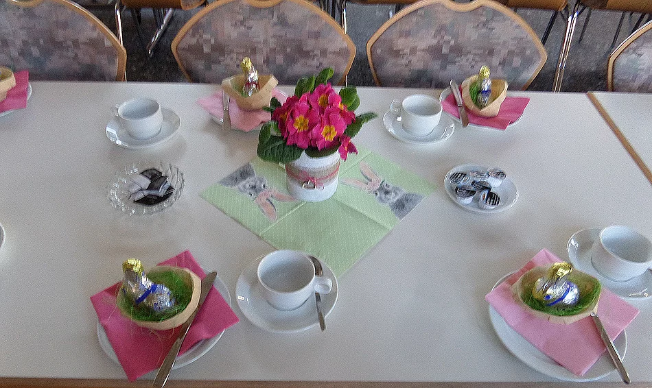 Am Gründonnerstag fand ein österliches Seniorenfrühstück mit rund 100 Besucherinnen und Besuchern statt. Ein besonderes Highlight war dabei der liebevoll gestaltete Tischschmuck, der bereits am Vortag angefertigt worden war.