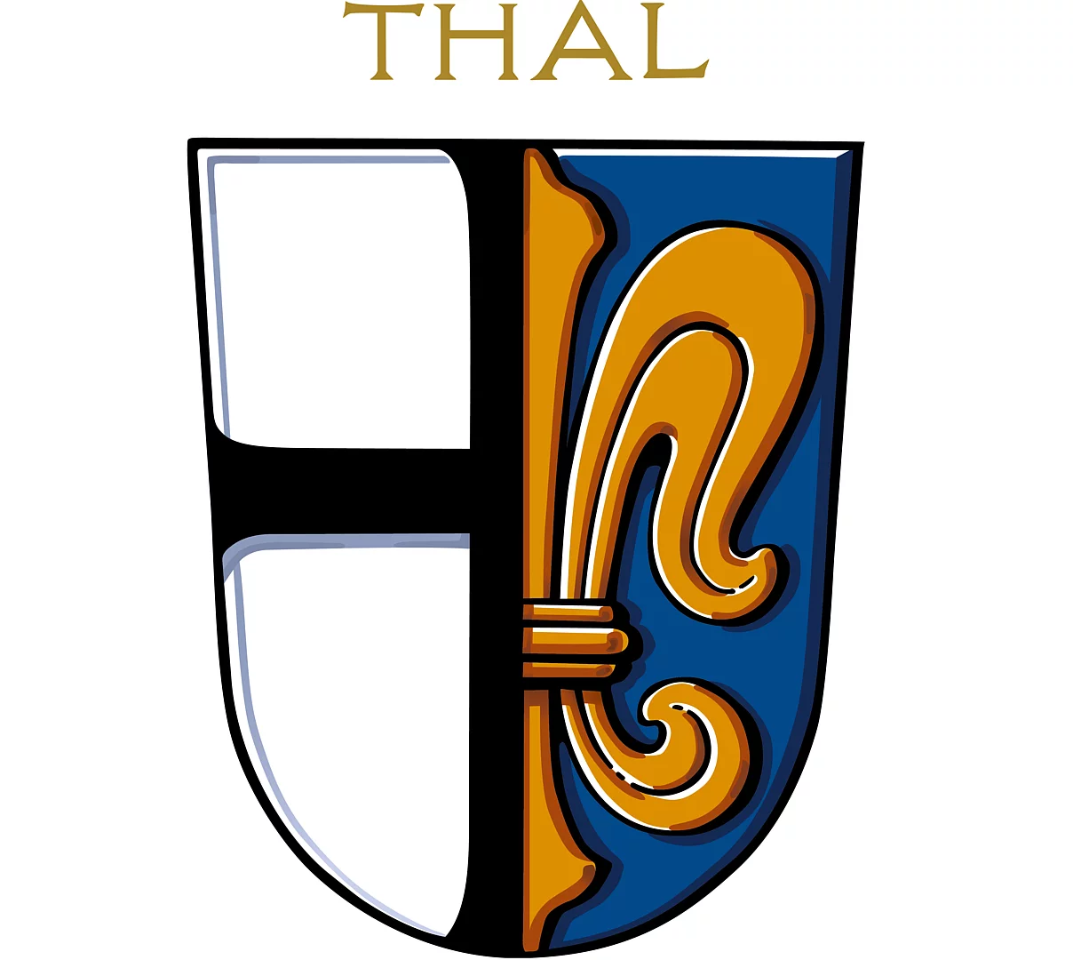 Das Tatzenkreuz steht für den Deutschen Orden bzw. der Deutschordenskommende Altshausen, die seit 1568 in Thal vier Höfe, eine Sölde und den Burgstall besaß. Im Besitz des Deutschen Ordens blieb der Komplex bis zur Enteignung im Jahre 1810. Die heraldische Lilie stammt aus dem Wappen des Augsburger Kaufmanngeschlechts Fugger. Die Lilie verweist auf die 1507 von Jakob Fugger in Thal erworbenen ca. 15 Anwesen, die bis 1806 zum Herrschaftsgebiet der Fugger zählten. Die Feldfarben silber und blau verweisen auf die heutige Zugehörigkeit zu Bayern.